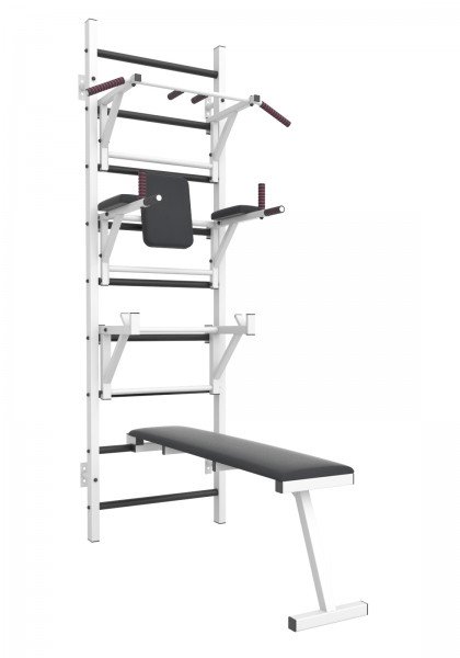 Комплектация: Шведская стенка + фиксированный турник + брусья с подлокотниками и спинкой, скамья для жима, упоры для штанги