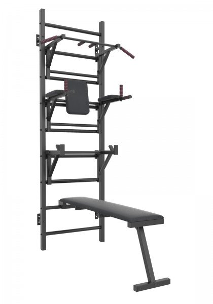 Комплектация: Шведская стенка + фиксированный турник + брусья с подлокотниками и спинкой, скамья для жима, упоры для штанги